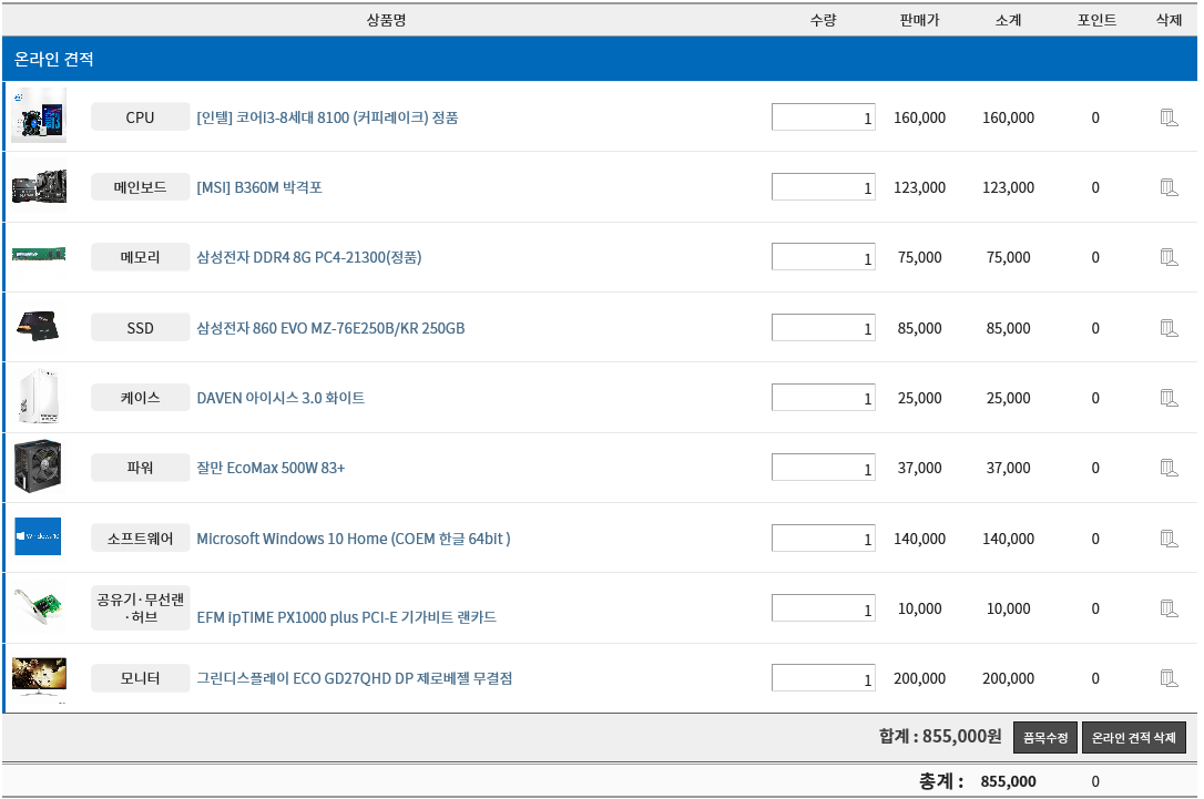 아래와 같이 견적을 넣어 봤는데, 이상 없이 돌아 가는지 궁금 합니다.